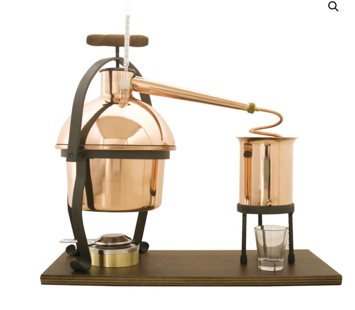 Con termometro, bollitore, vasca di raccolta e serpentina di raffreddamento, su base in legno
