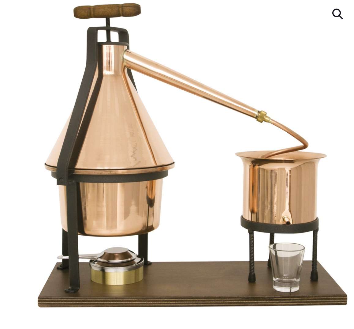 Con termometro, bollitore, vasca di raccolta e serpentina di raffreddamento, su base in legno