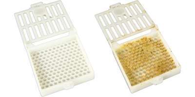 Gabbietta Scalvini in plastica per effettuare il blocco di covataimprigionandovi la regina. Viene inserita al centro di un favo del nido dopo averne ritagliato la porzione corrispondente. È composta da un fondo con cellette femminili già improntate, dove la regina durante la reclusione depone, un coperchio che fa da escludiregina, permettendo alle api di accudire regina e covata e un tappo per liberare la regina, senza aprire la gabbietta. Molto interessante il fatto che, nonostante le dimensioni ridotte della gabbietta, le api asportando parte della covata deposta permetteno alla regina di deporre per tutto il periodo della reclusione.