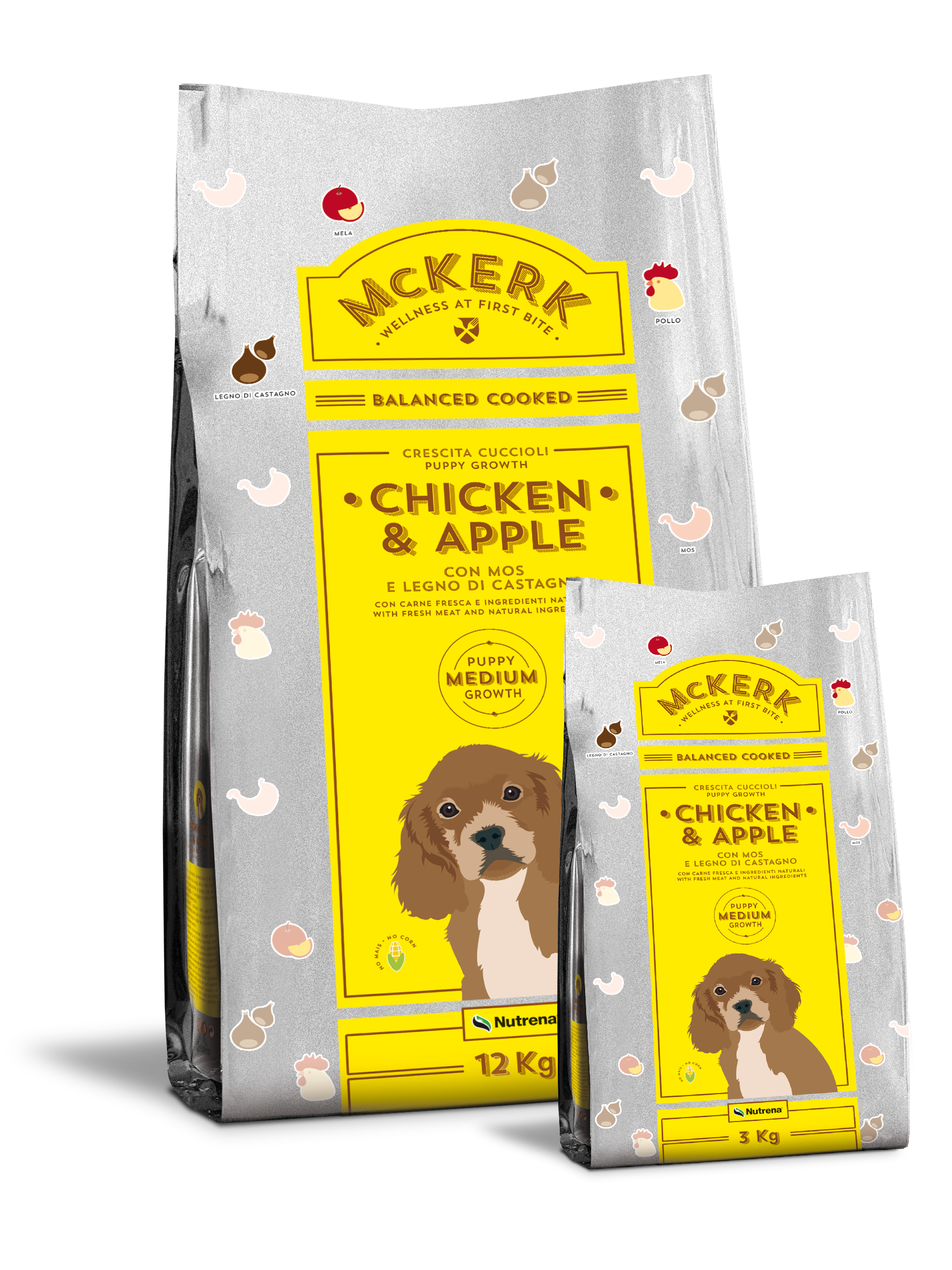Per crescere sano e forte, il vostro cucciolo necessita di una dieta nutriente che gli fornisca il giusto apporto energetico. Per questo motivo la ricerca Nutrena ha ideato appositamente per lui McKerk Dog Puppy Medium Chicken & Apple, una gustosa ricetta arricchita con carne fresca di pollo, fonte proteica altamente digeribile, e mela, che favorisce la regolarità del transito intestinale. L’aggiunta di MOS e legno di castagno stimola l’azione antibatterica e disinfettante a livello intestinale, per favorire la salute e un corretto sviluppo del vostro cucciolo.