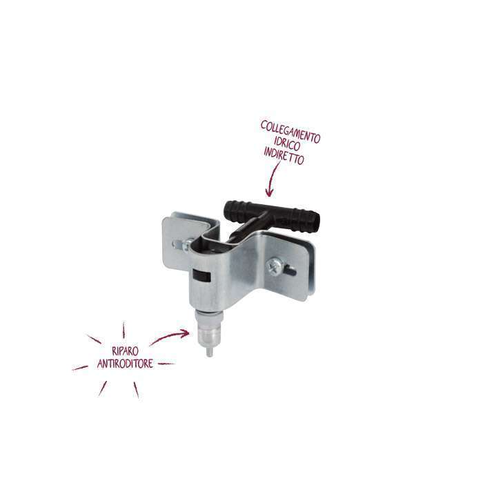 Abbeveratoio con valvola in acciaio inox e attacco a viti e innesto TEE 10/7 per il collegamento idrico indiretto. Può essere fissato alla rete delle gabbie di conigli e gallinacei. Speciale protezione antiroditore.