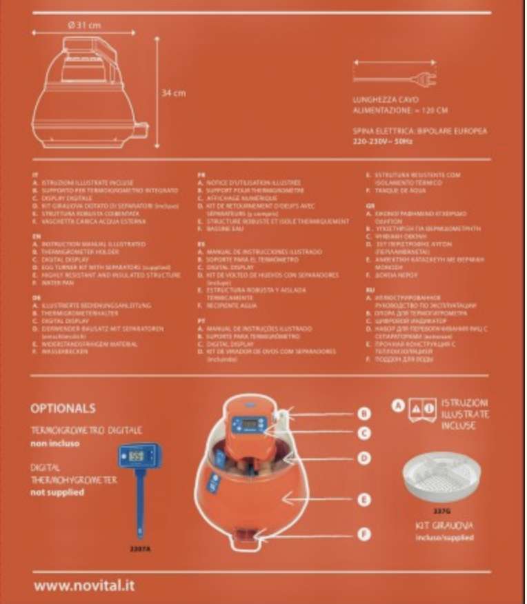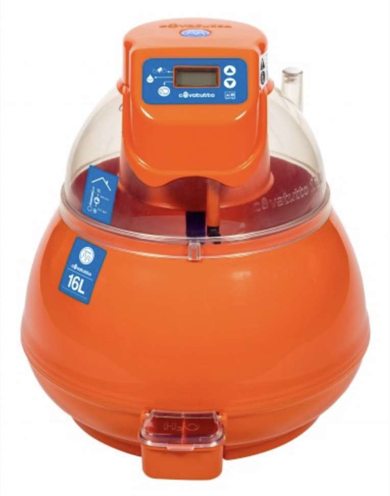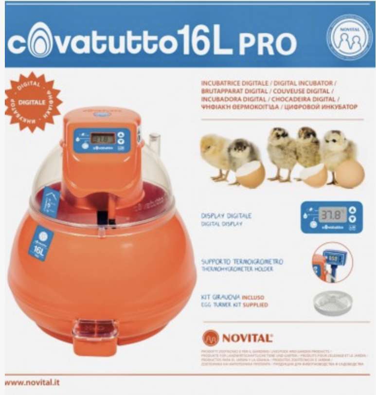 Nuova incubatrice Covatutto 16L Pro, super compatta, ideale per chi si avvicina al mondo dell’avicoltura e vuole provare il piacere di incubare senza pensieri o per coloro che necessitano di incubare un numero contenuto di uova; la scocca superiore supporta un display digitale dal quale impostare la macchina all’inzio dell’incubazione (numero giorni, promemoria rabbocco acqua, girauova automatico).